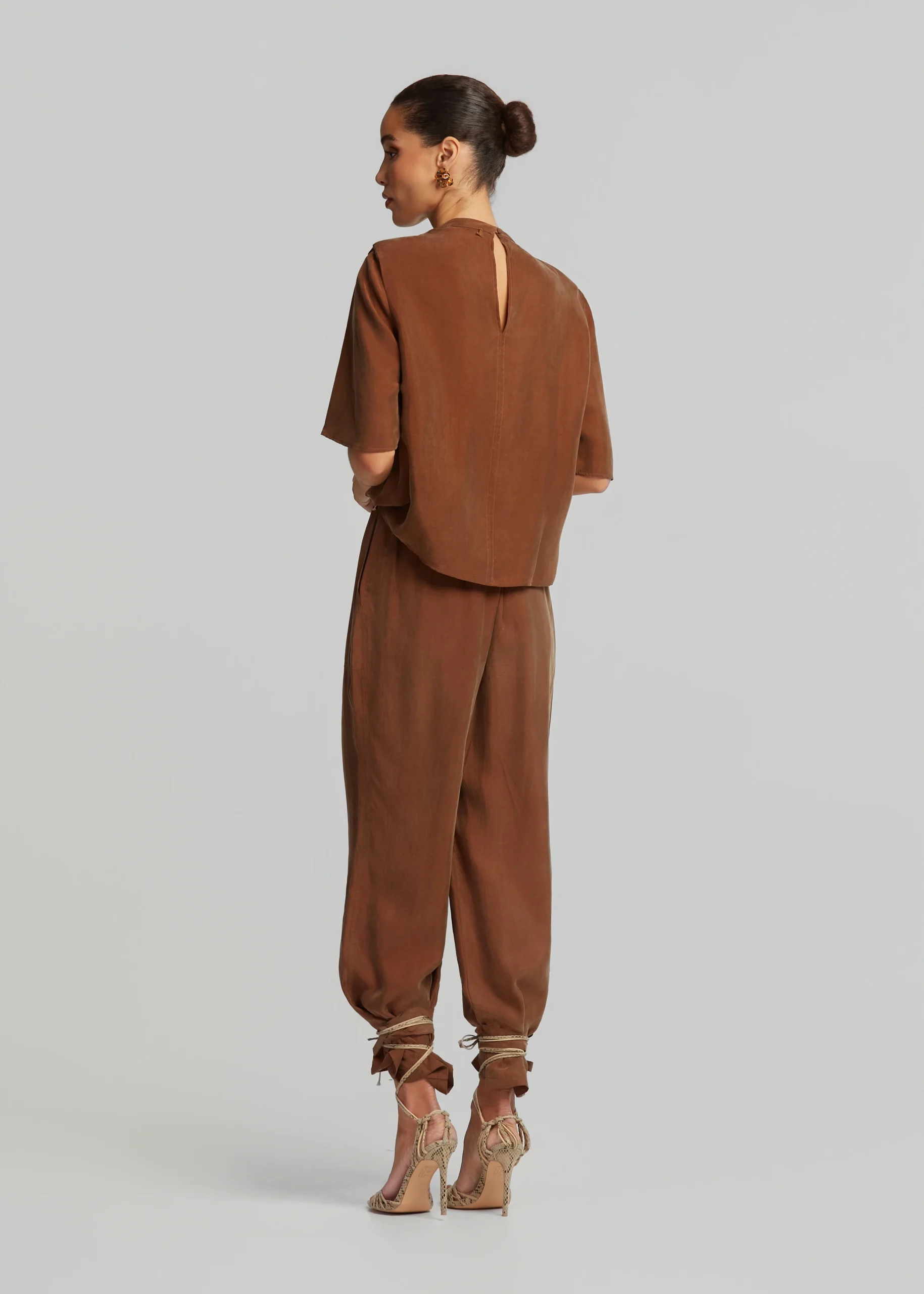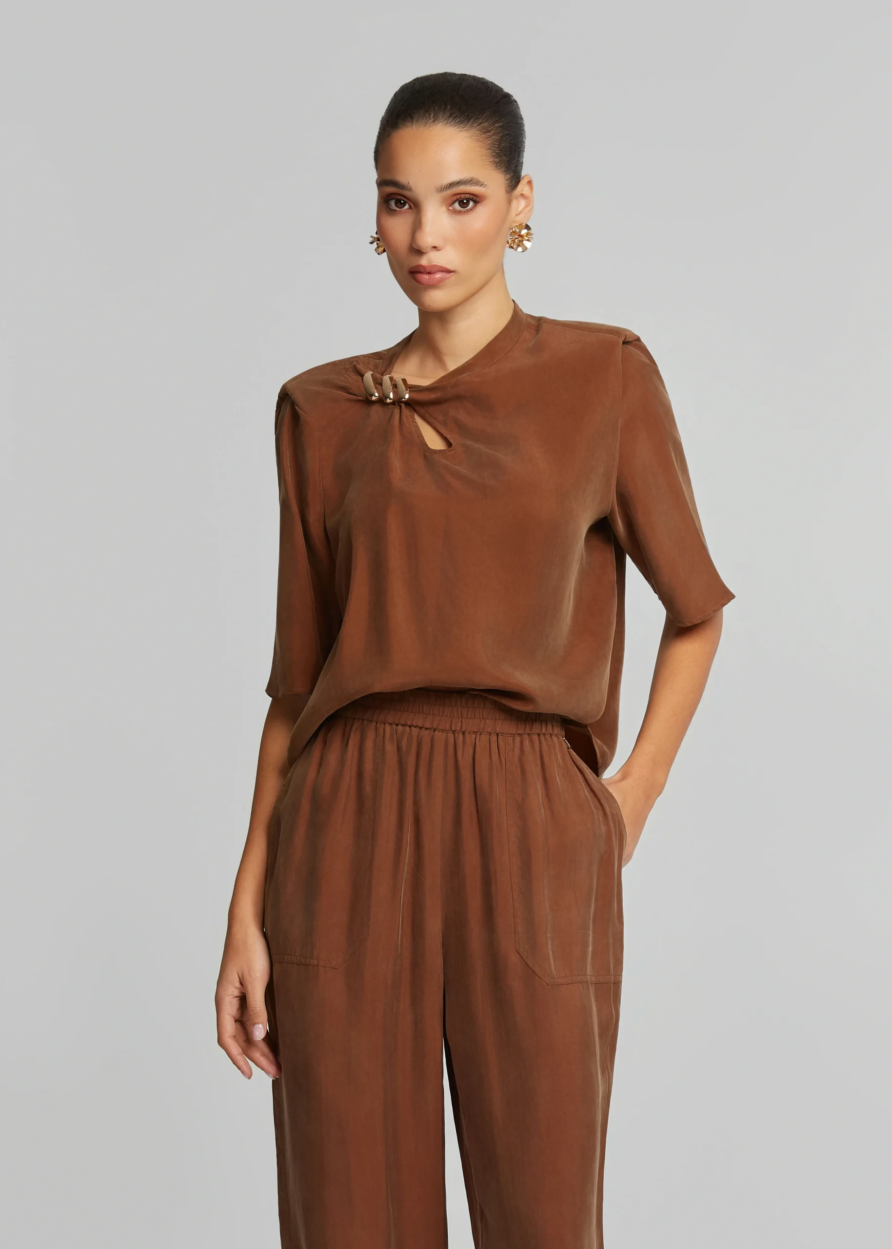 - Short-sleeved blouse in vegan silk with metallic detail