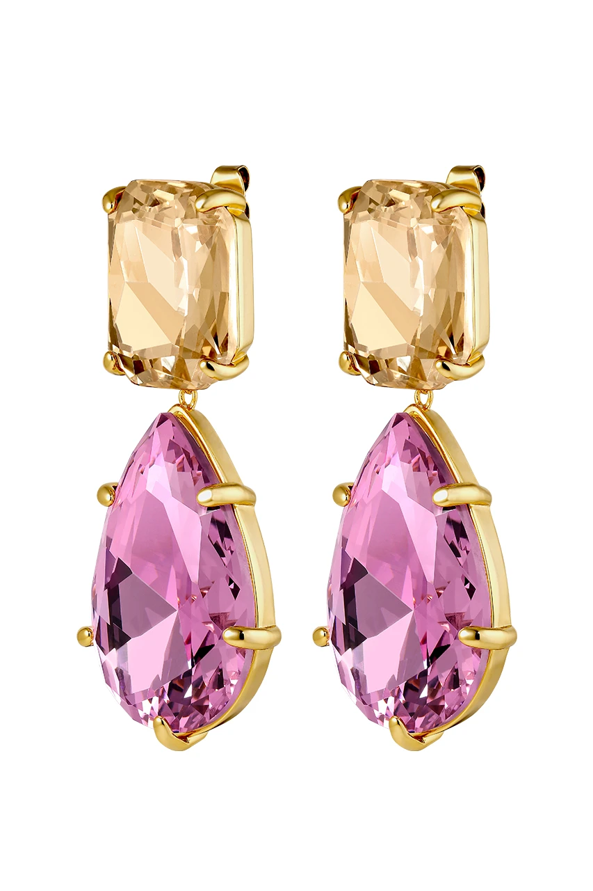 GOLARI – a magnificent drop earpost, consisting of a gigantic, prong set facet crystal drop pendant under a smaller emerald cut crystal. Stud post. Total length 5 cm. Here shown in gold tone finish, with peach and light rose crystals.