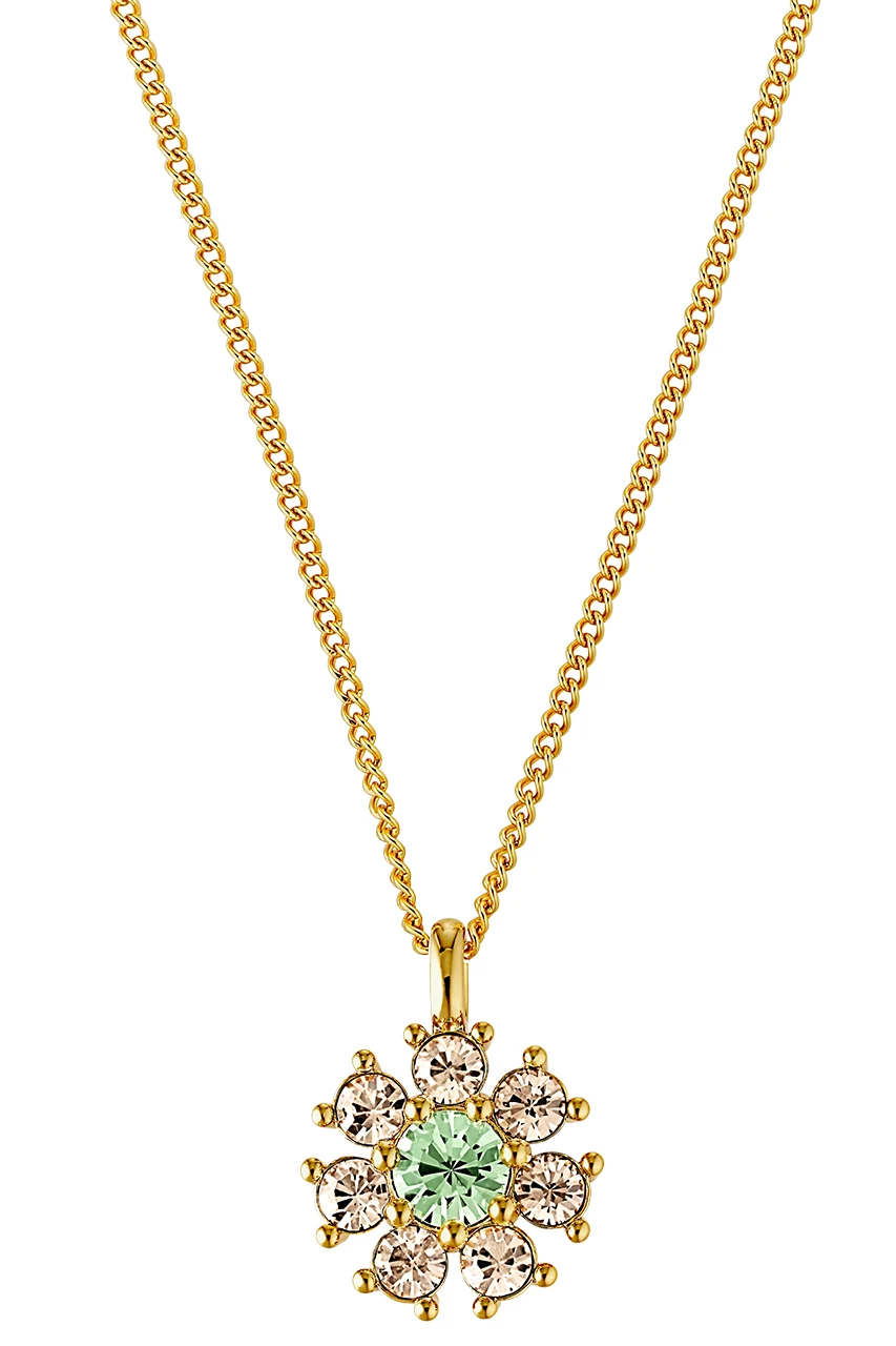 DELISE – a romantic and retro-inspired neck chain, made in stainless steel- adorned with a pendant formed as a roset in glittering crystals. The chain ais 42 cm long with an extension chain of 5 cm. The rosette measures 18 mm in diameter. As pretty with a simple shirts as with an evening dress. Here shown in a golden and water green variation on gold tone base. Allergy tested and designed in Denmark
