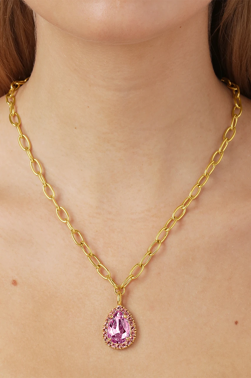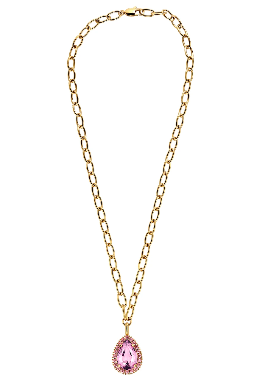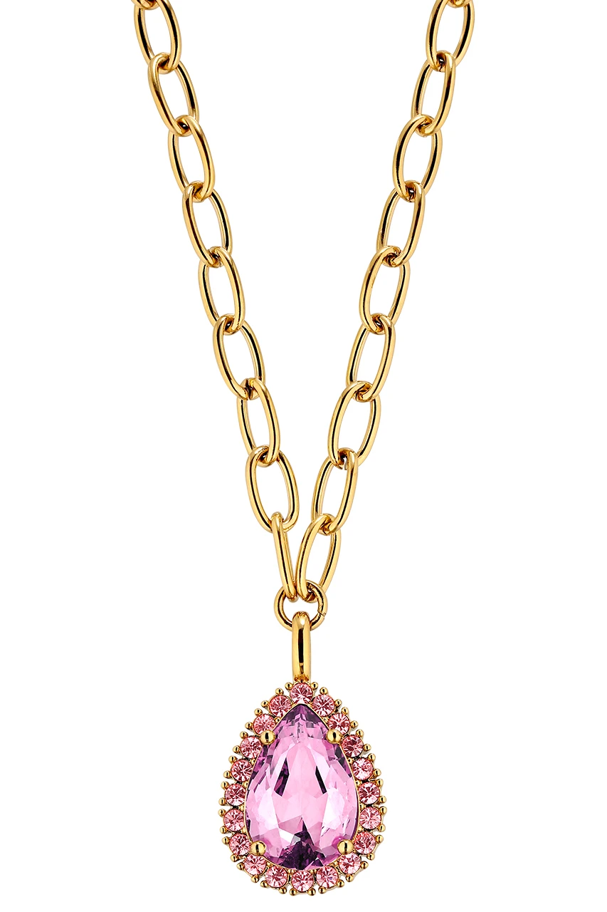 METTA is a modern romantic chunky short neck chain made in heavy linked design. The solitaire pendant features a large 25 mm long sparkling rose coloured facetted drop shape , flanked with multiple smaller light rose crystals. Chain and pendant made in brass. Here shown in shiny gold tone finish. Total length 50 cm. DANISH DESIGN – free of cadmium, lead and nickel.