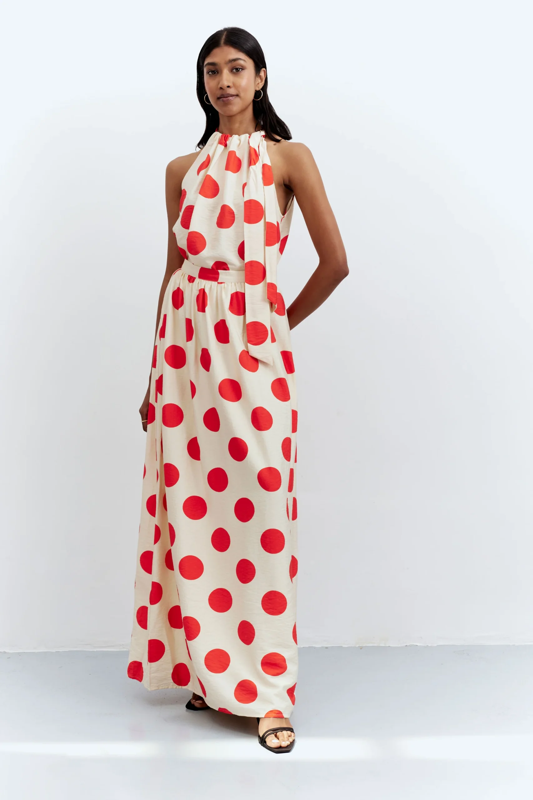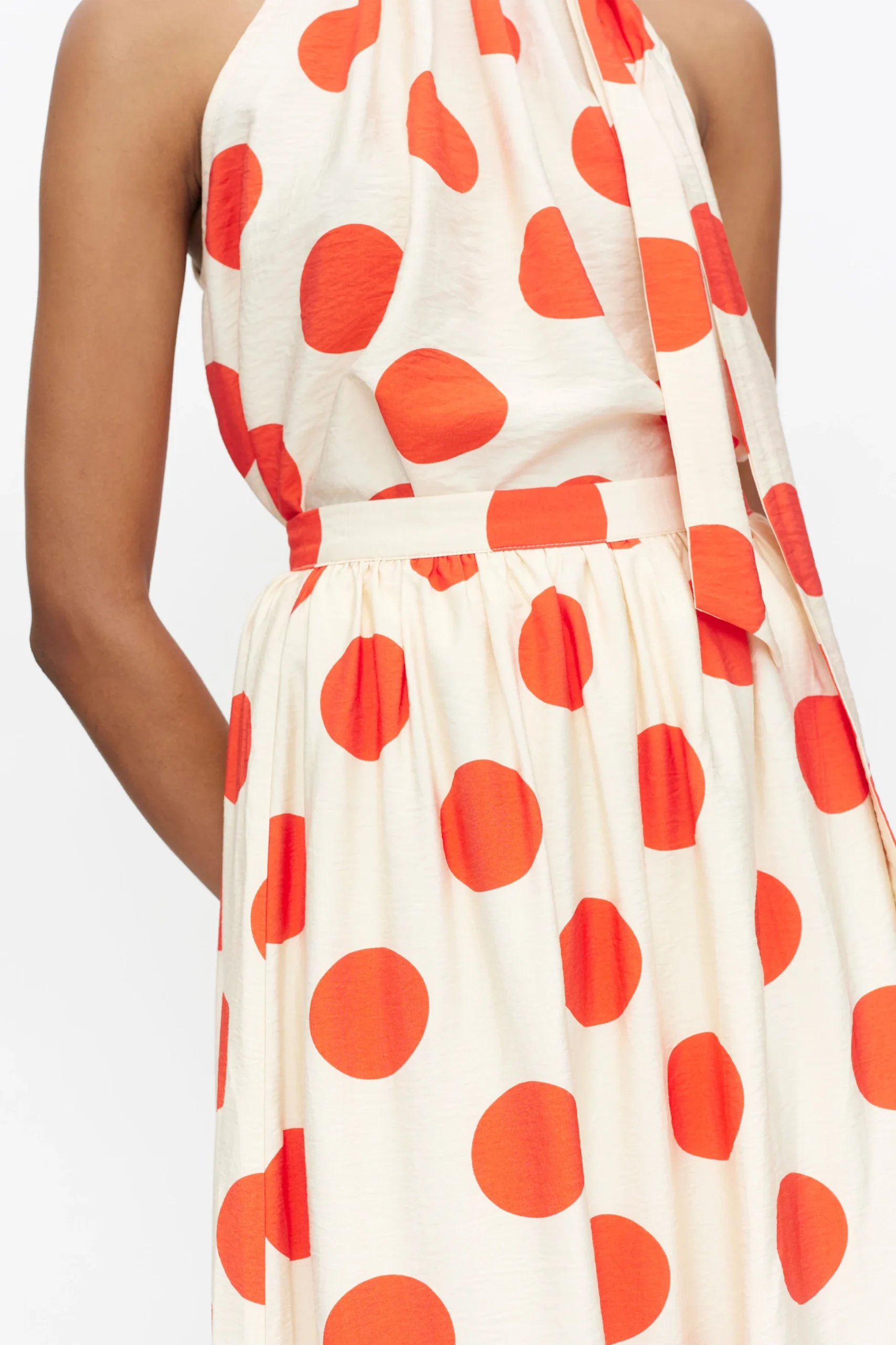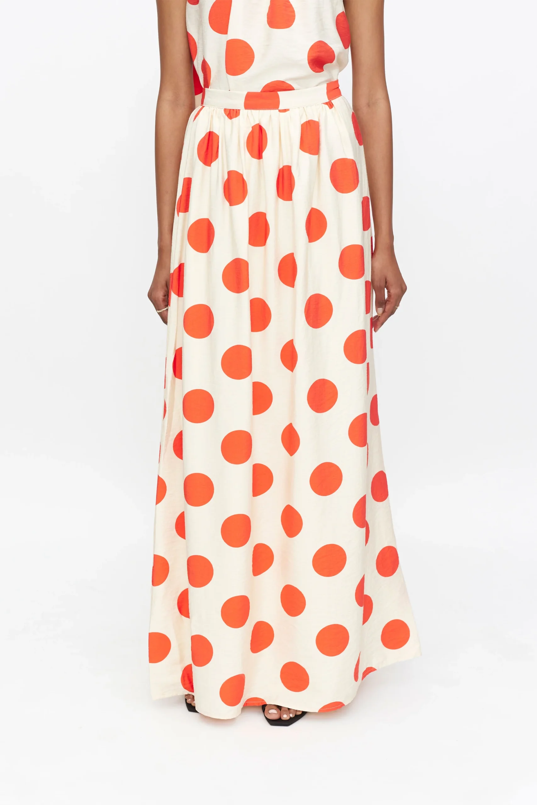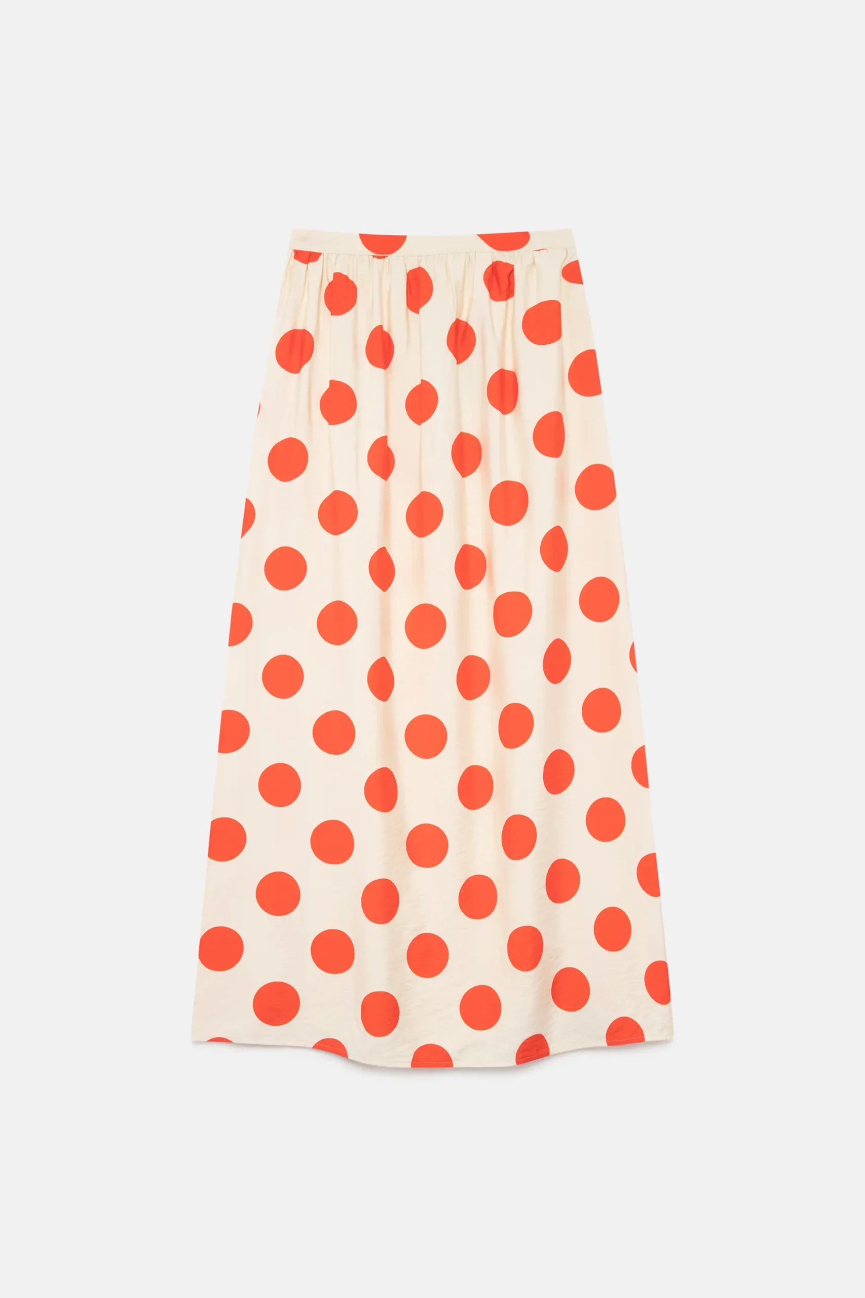 Long fluid skirt in crepe fabric with polka dot print. With a fixed high-rise waist. Side closure with invisible zipper. Inner lining. The model is 172 cm tall and wears size S.