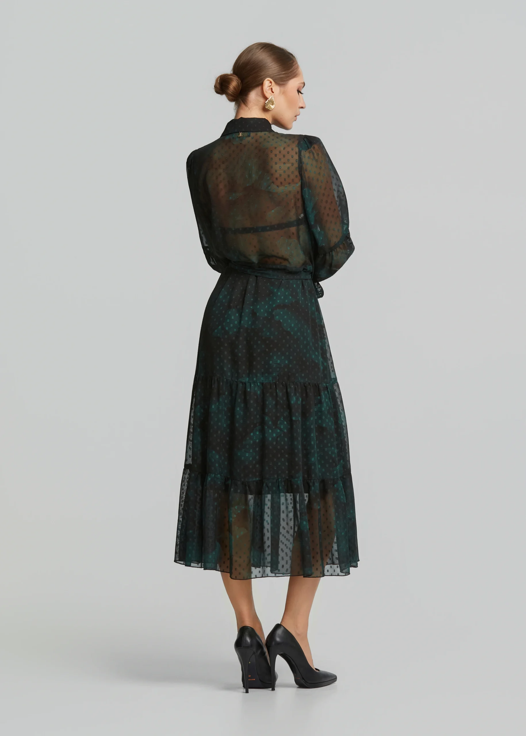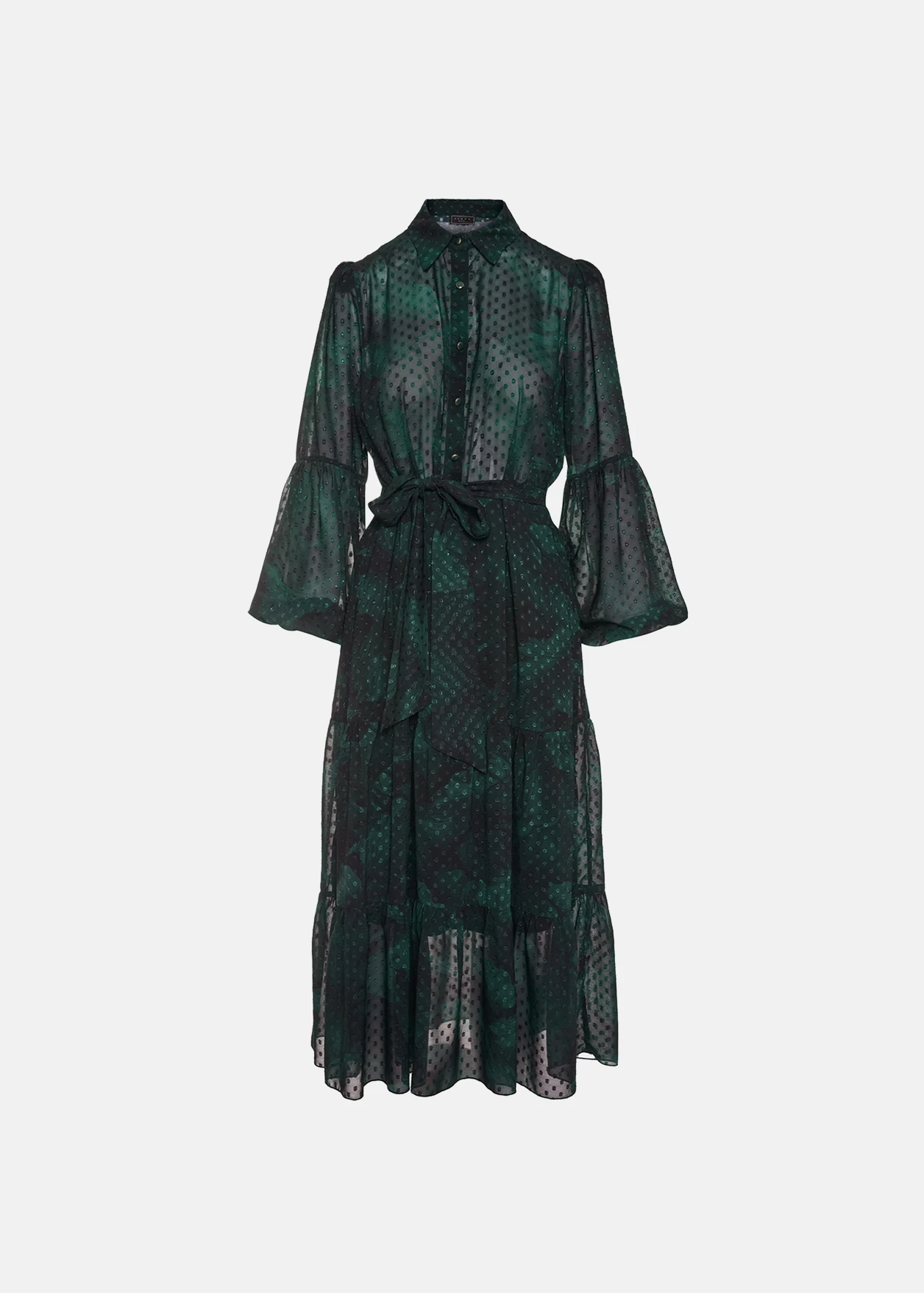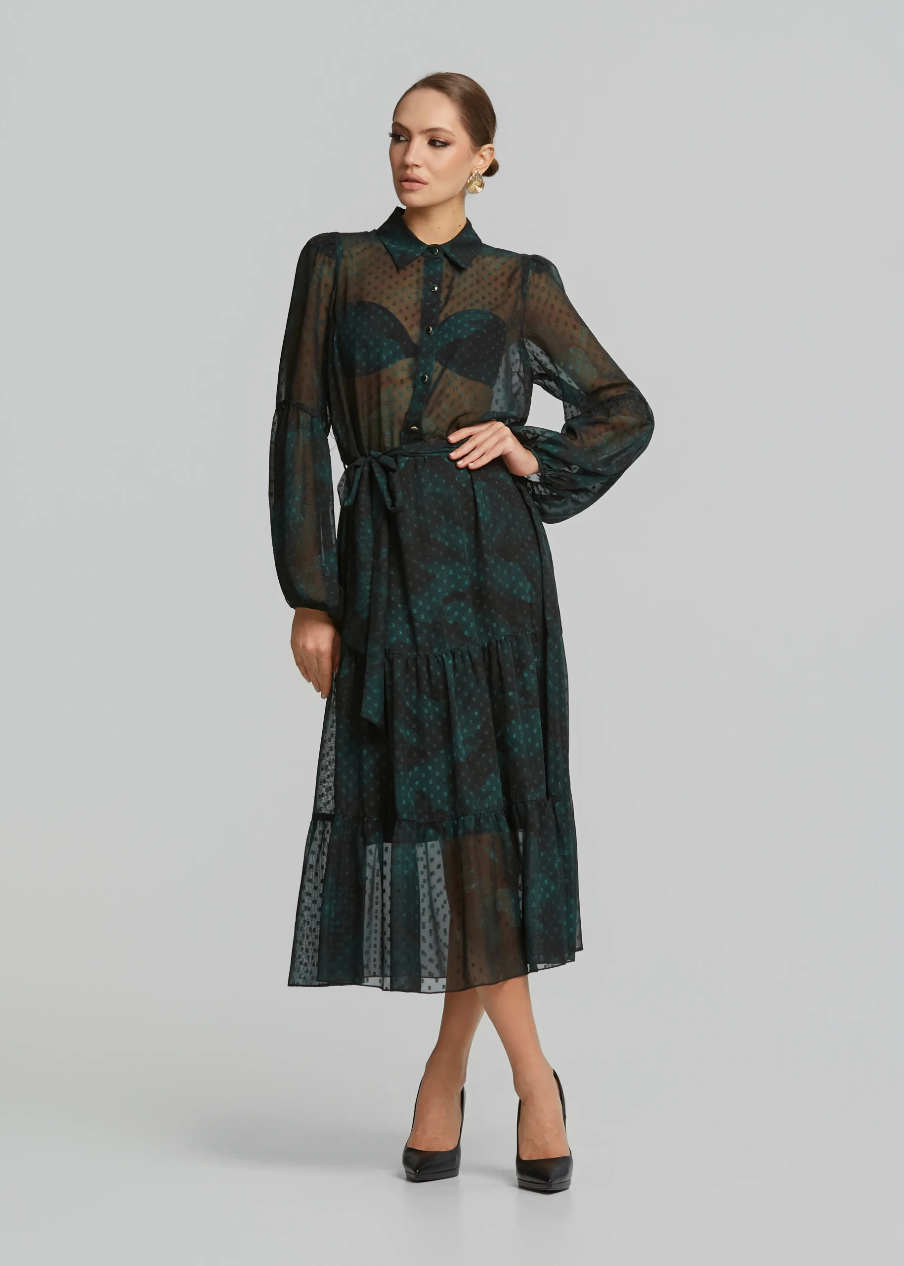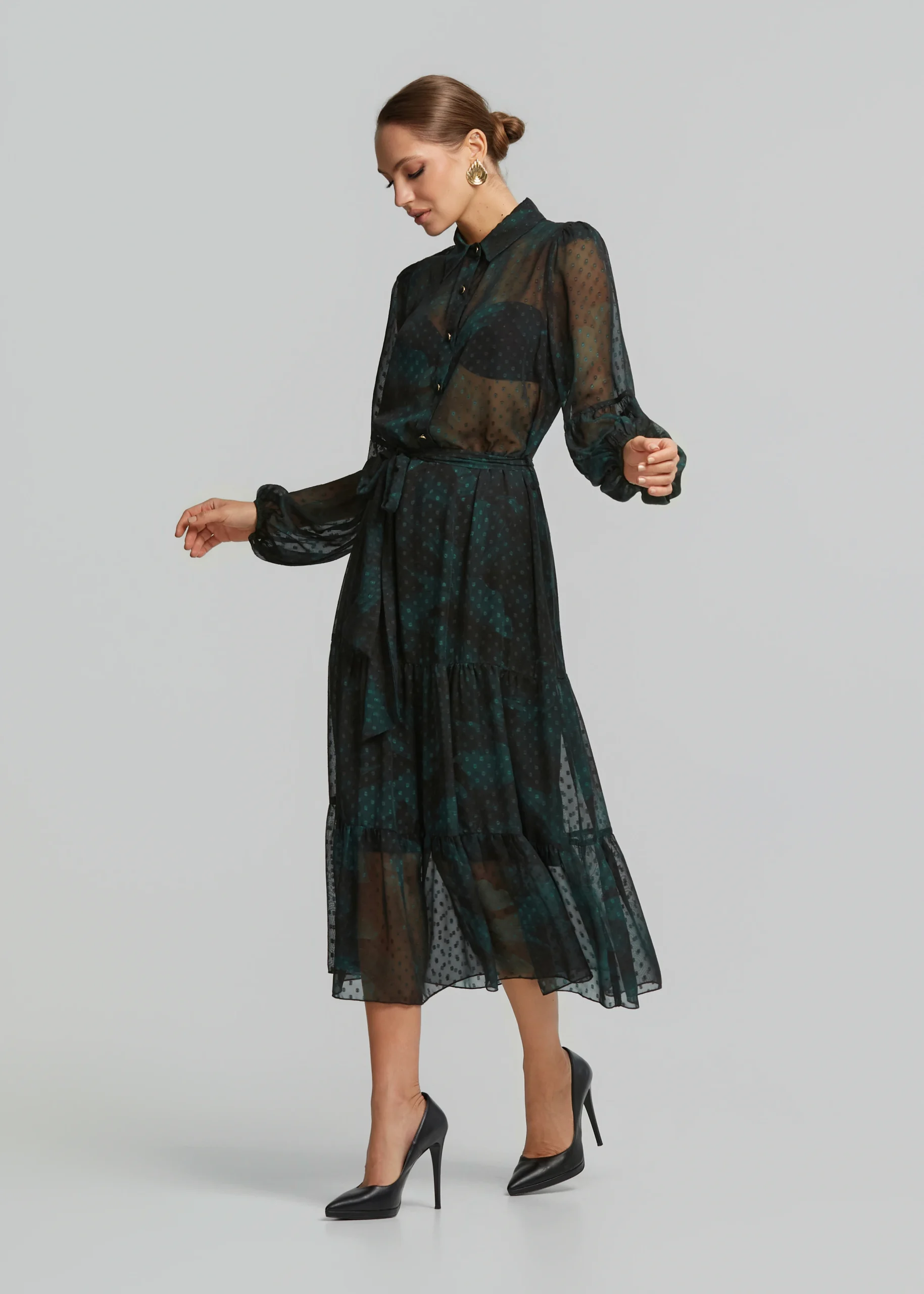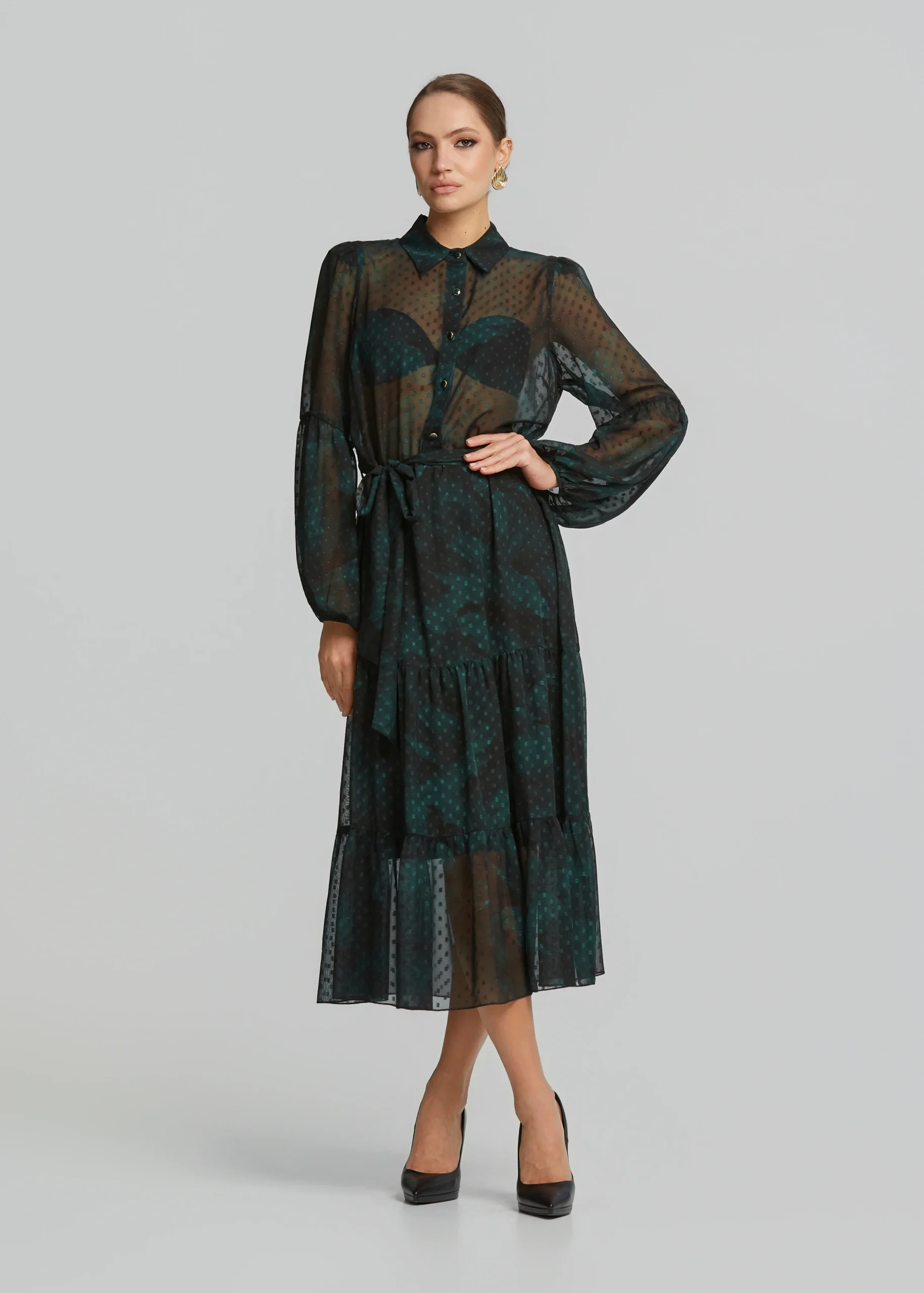 - Printed muslin-look chiffon dress with bold sleeves