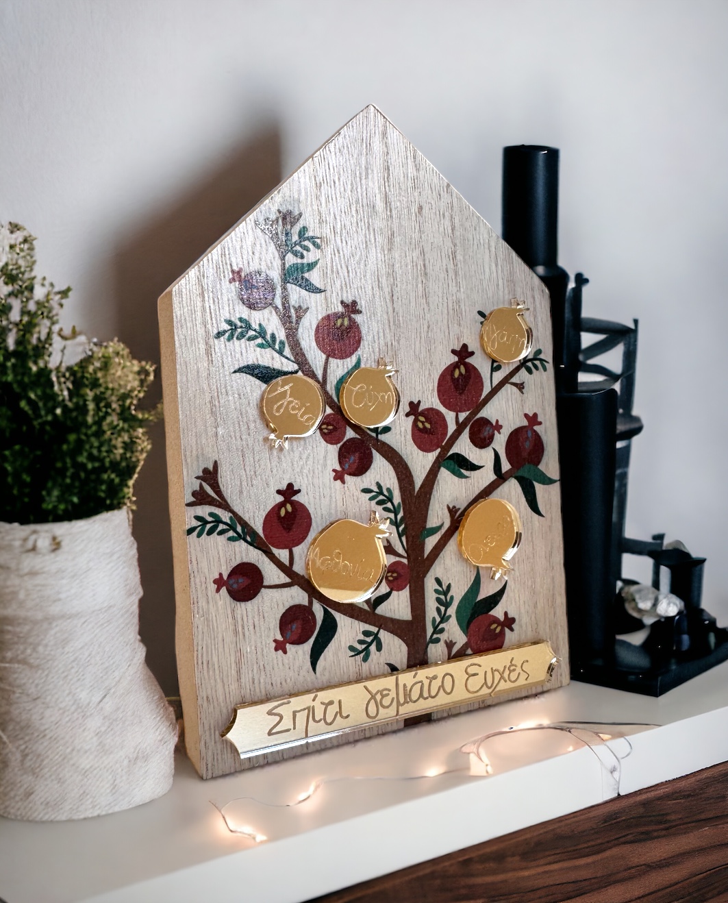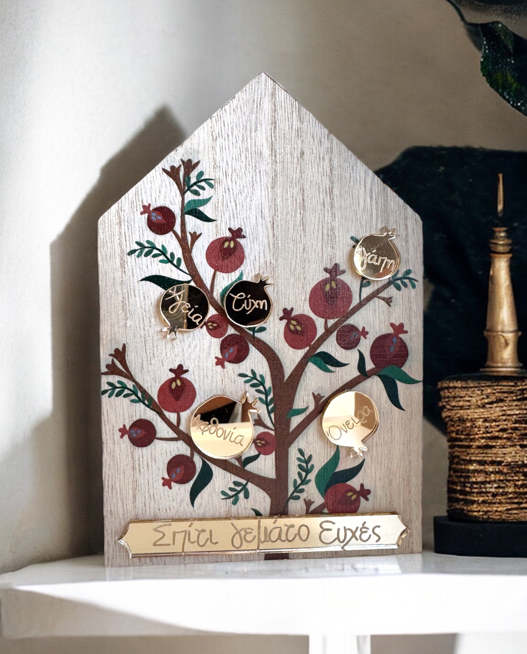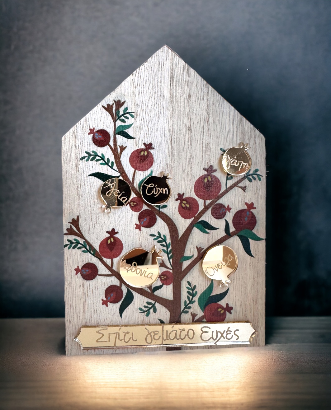 Add a special touch of good luck to your space with the handmade table charm that will bring happiness and protection to your home. This unique charm is in the form of a beautiful wooden house, which has been painted with a special pomegranate tree, giving it a unique and enchanting look. The charm is decorated with a 3D plexiglass and the wish “Home full of wishes” in gold tone and 3D golden pomegranates. Renovate your home or gift it to your loved ones! Don’t forget to complete your gift by adding gift wrapping and a greeting card! All our charms are designed and manufactured by our team in our workshop.