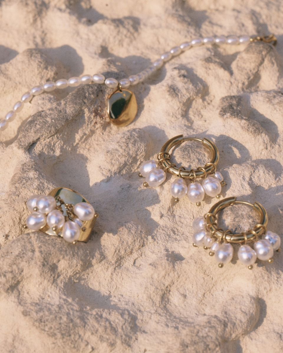 Pearl Signet is a blend of shiny metal and small, organically shaped pearls in mother-of-pearl, resembling the first buds of spring. A romantic look for when you want to show your softer side. The line’s ring has eight pearls in two different sizes hanging in a cluster on a slightly wider band in 14K gold plating. These move beautifully together on your hand.