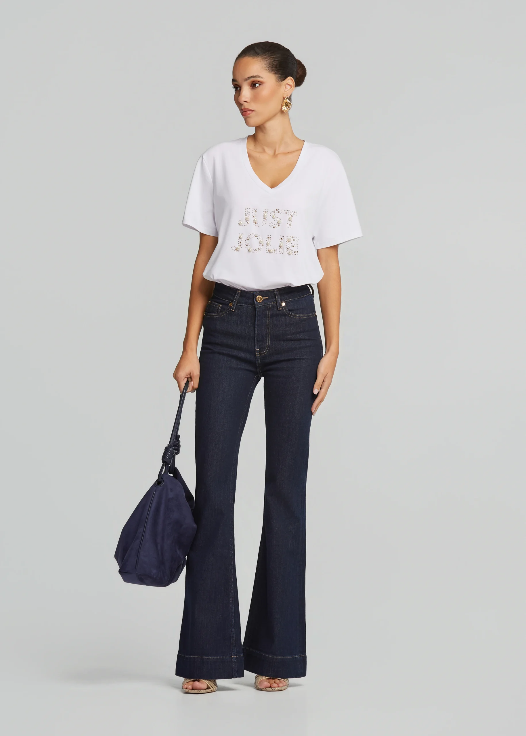 - V-neck blouse, decorated with pearls and rhinestones in a comfortable fit