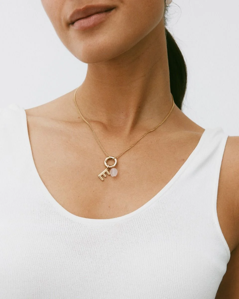 - Rose quartz, shiny 14K gold plating on stainless steel