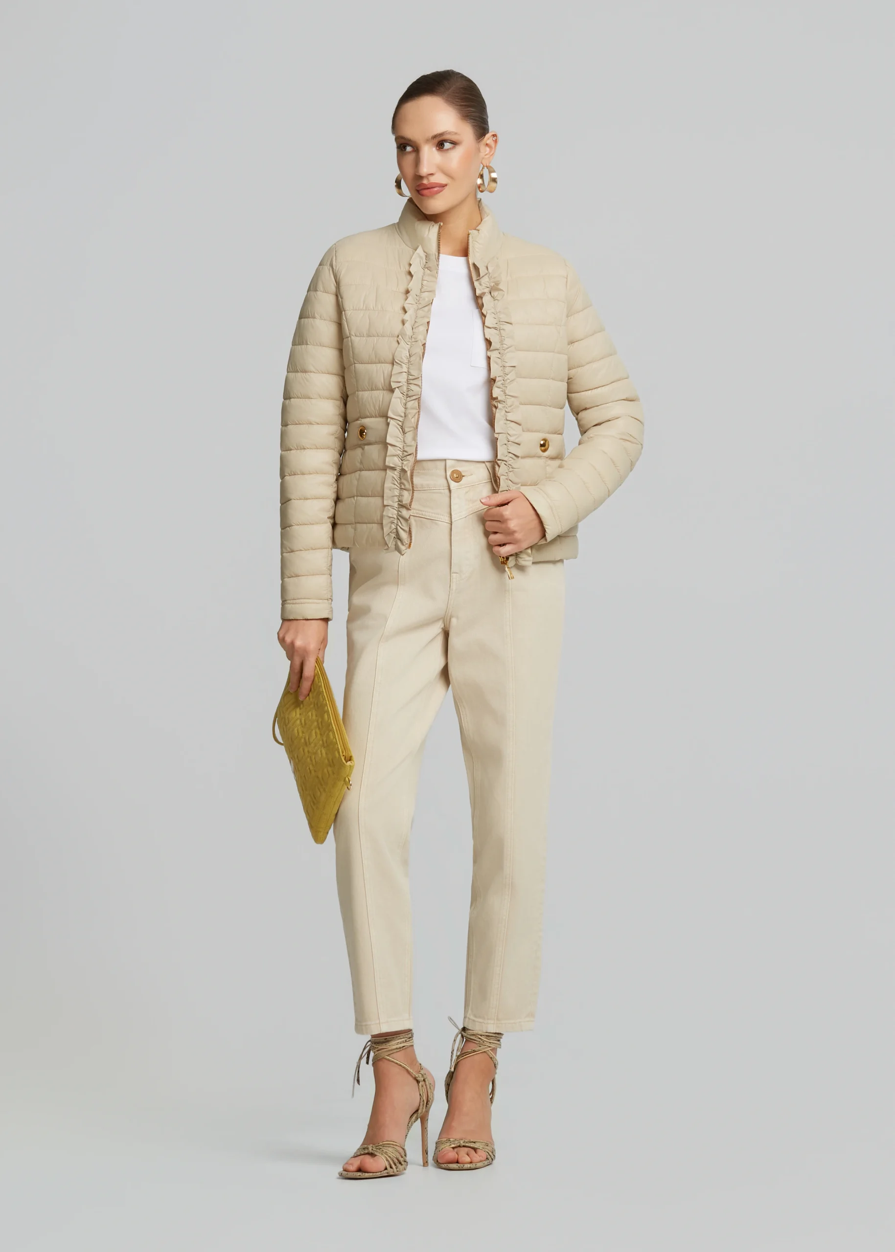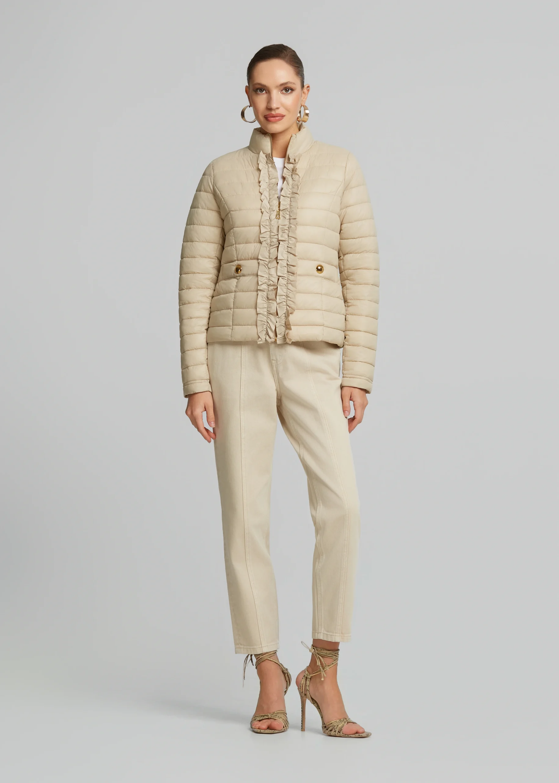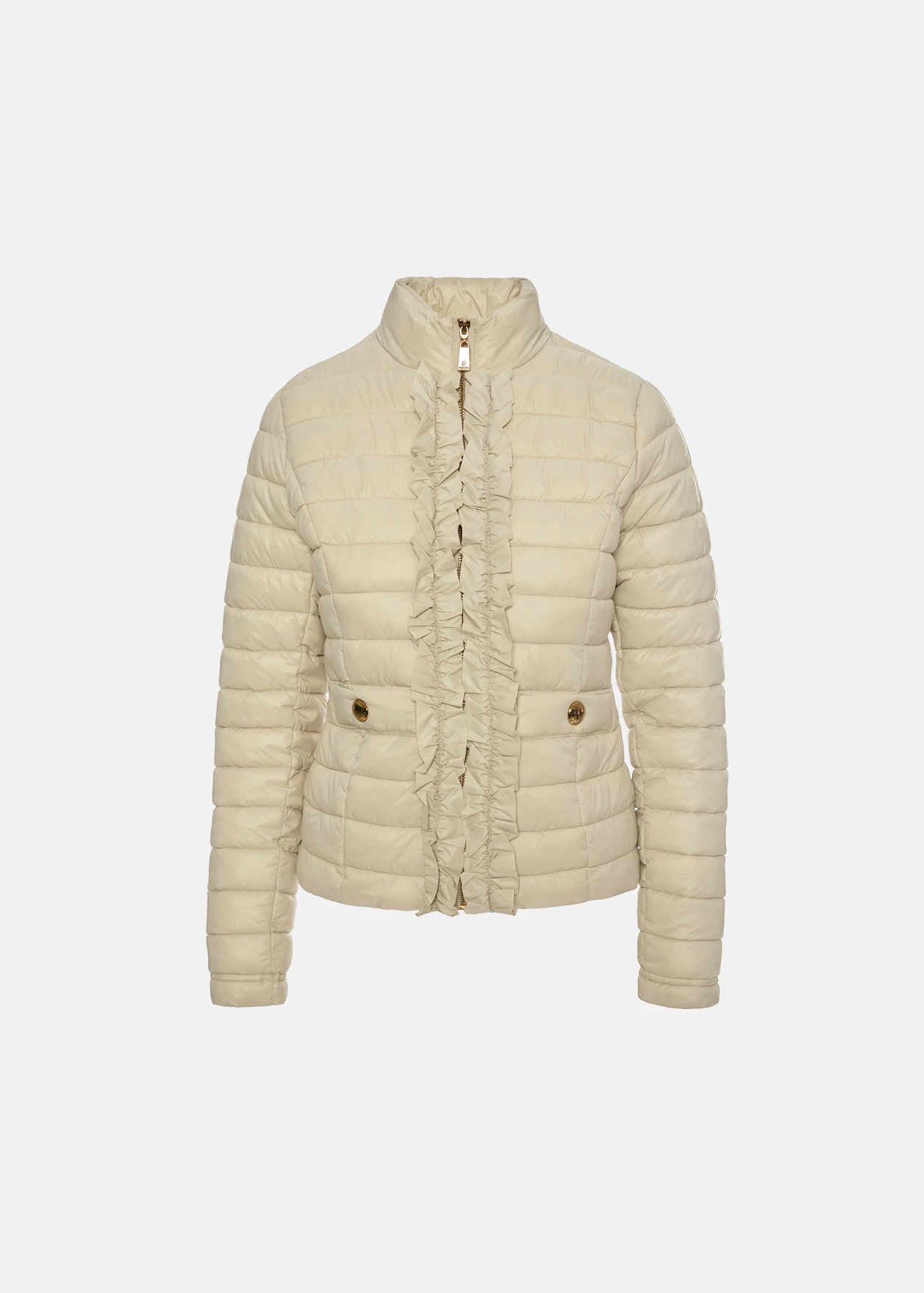 • Waterproof jacket with high neck and decorative ruffles