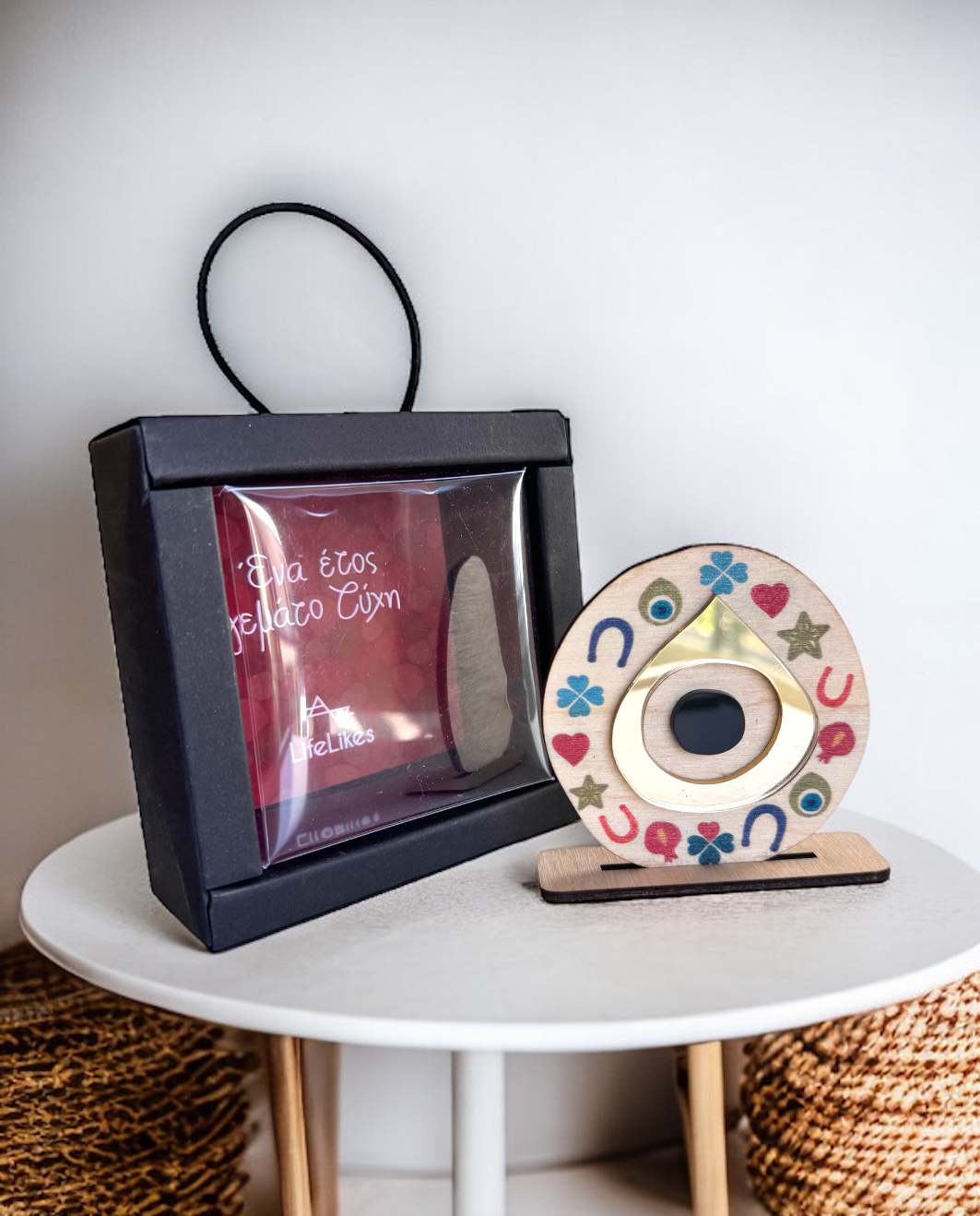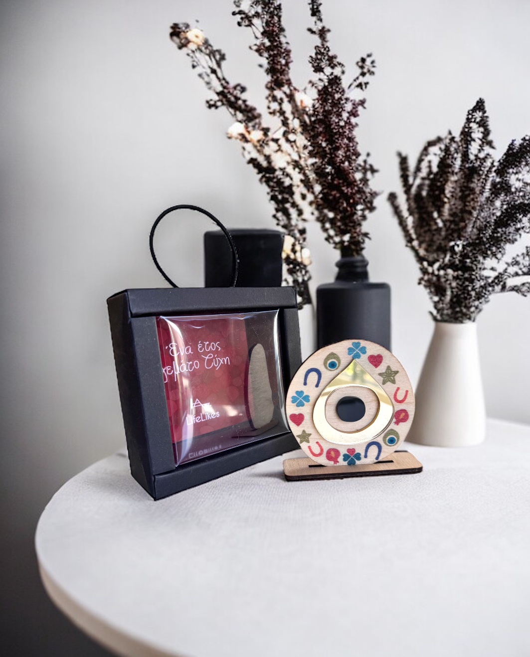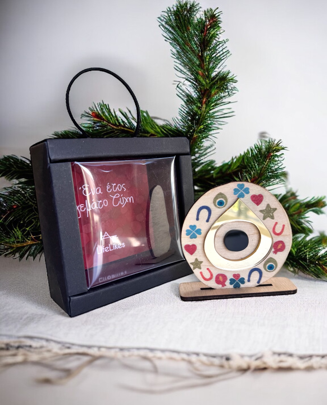 Συνδυασμενο με ευχες για υγεια, αγαπη, και καλοτυχια, το γουρι αυτο ειναι το τελειο δωρο για την εναρξη της νεας χρονιας η οποιαδηποτε αλλη σημαντικη στιγμη. Διακοσμημενο στο σπιτι η σε οποιοδηποτε αλλο χωρο, προσφερει προστασια και ενισχυει τη θετικη ενεργεια, υπενθυμιζοντας καθημερινα τις ευχες και την αγαπη των ανθρωπων που μας το χαρισαν. Ενα γουρι με ματι δεν ειναι μονο ενα ομορφο διακοσμητικο, αλλα και ενας συμμαχος για καλη τυχη και ευτυχια. Ειναι κατασκευασμενο απο ξυλο, με τυπωμενες ευχες και τρισδιαστατο ματι απο χρυσο και μαυρο plexiglass. Τελειοποιηστε το δωρο σας προσθετοντας συσκευασια δωρου και ευχετηρια καρτα!Ολα μας τα γουρια σχεδιαζονται και κατασκευαζονται απο την ομαδα μας στο εργαστηριο μας.