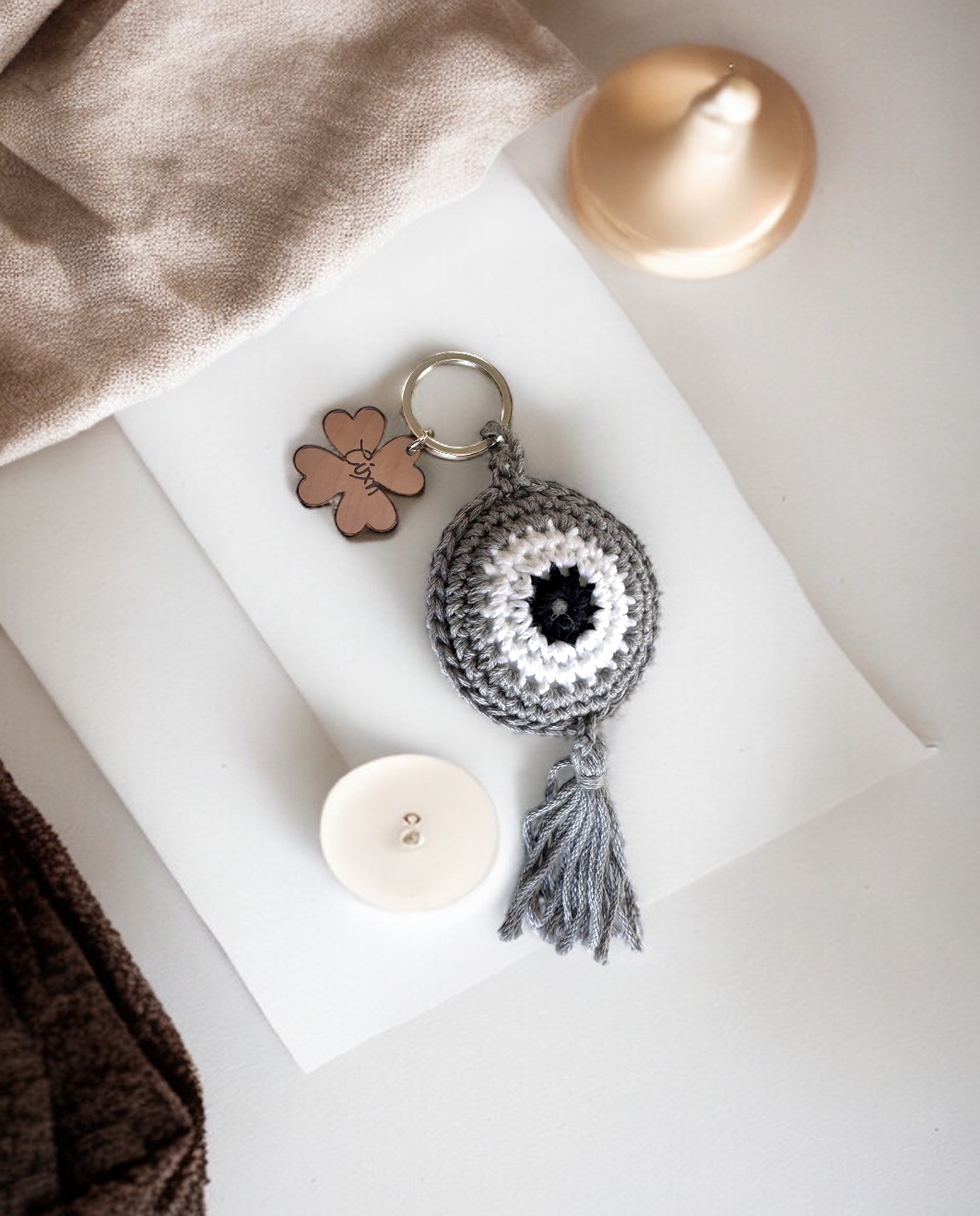 Ένα γουράκι μπρελόκ σε σχήμα πλεκτού ματιού είναι μια όμορφη και συμβολική επιλογή που συνδυάζει την παραδοσιακή τέχνη με την προστασία από το κακό μάτι. Το πλεκτό μάτι συμβολίζει την καλή τύχη και την προστασία, και το μπρελόκ είναι πρακτικό και ευέλικτο για καθημερινή χρήση. Έχει κρεμαστό ταμπελάκι σε σχήμα τετράφυλλου τριφυλλιού, με την ευχή “τυχη”. Τελειοποιήστε το δώρο σας προσθέτοντας ευχετήρια κάρτα! Όλα μας τα γούρια σχεδιάζονται και κατασκευάζονται από την ομάδα μας στο εργαστήριο μας.