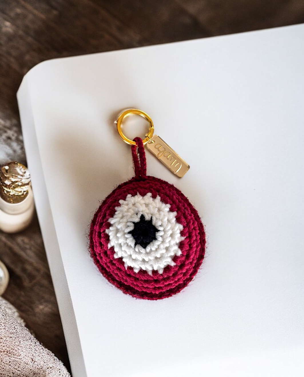 Ένα γουράκι μπρελόκ σε σχήμα πλεκτού ματιού είναι μια όμορφη και συμβολική επιλογή που συνδυάζει την παραδοσιακή τέχνη με την προστασία από το κακό μάτι. Το πλεκτό μάτι συμβολίζει την καλή τύχη και την προστασία, και το μπρελόκ είναι πρακτικό και ευέλικτο για καθημερινή χρήση. Έχει κρεμαστό ταμπελάκι, με την ευχή “αγάπη”. Τελειοποιήστε το δώρο σας προσθέτοντας ευχετήρια κάρτα! Όλα μας τα γούρια σχεδιάζονται και κατασκευάζονται από την ομάδα μας στο εργαστήριο μας.
