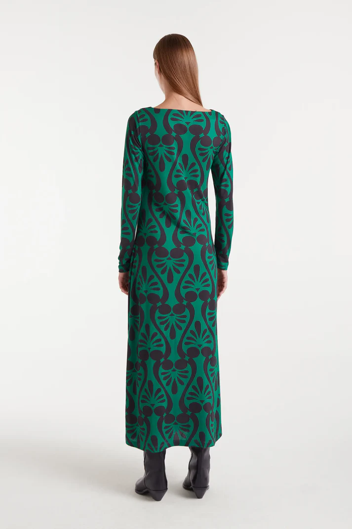 Μακρύ πράσινο φόρεμα με μπαρόκ στάμπα. Διαθέτει λαιμόκοψη και μακριά μανίκια. Το μοντέλο έχει ύψος 177 εκ. και φοράει μέγεθος S.