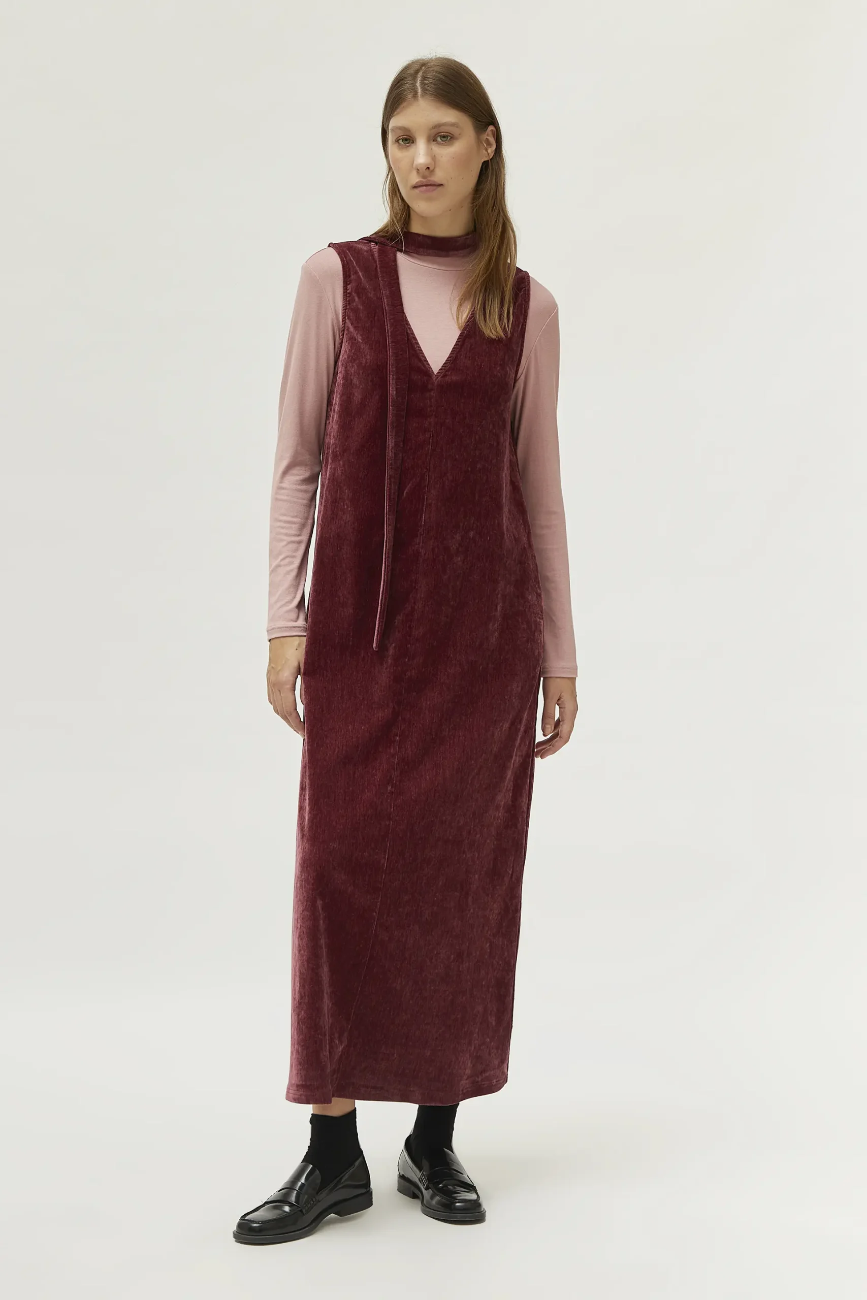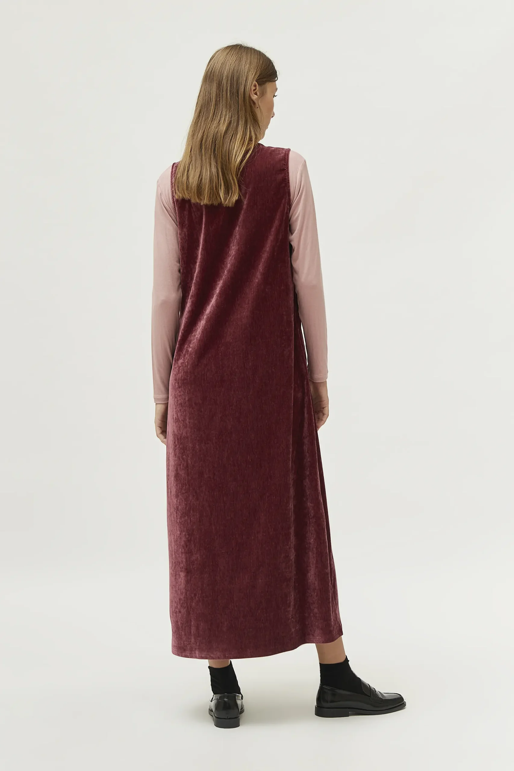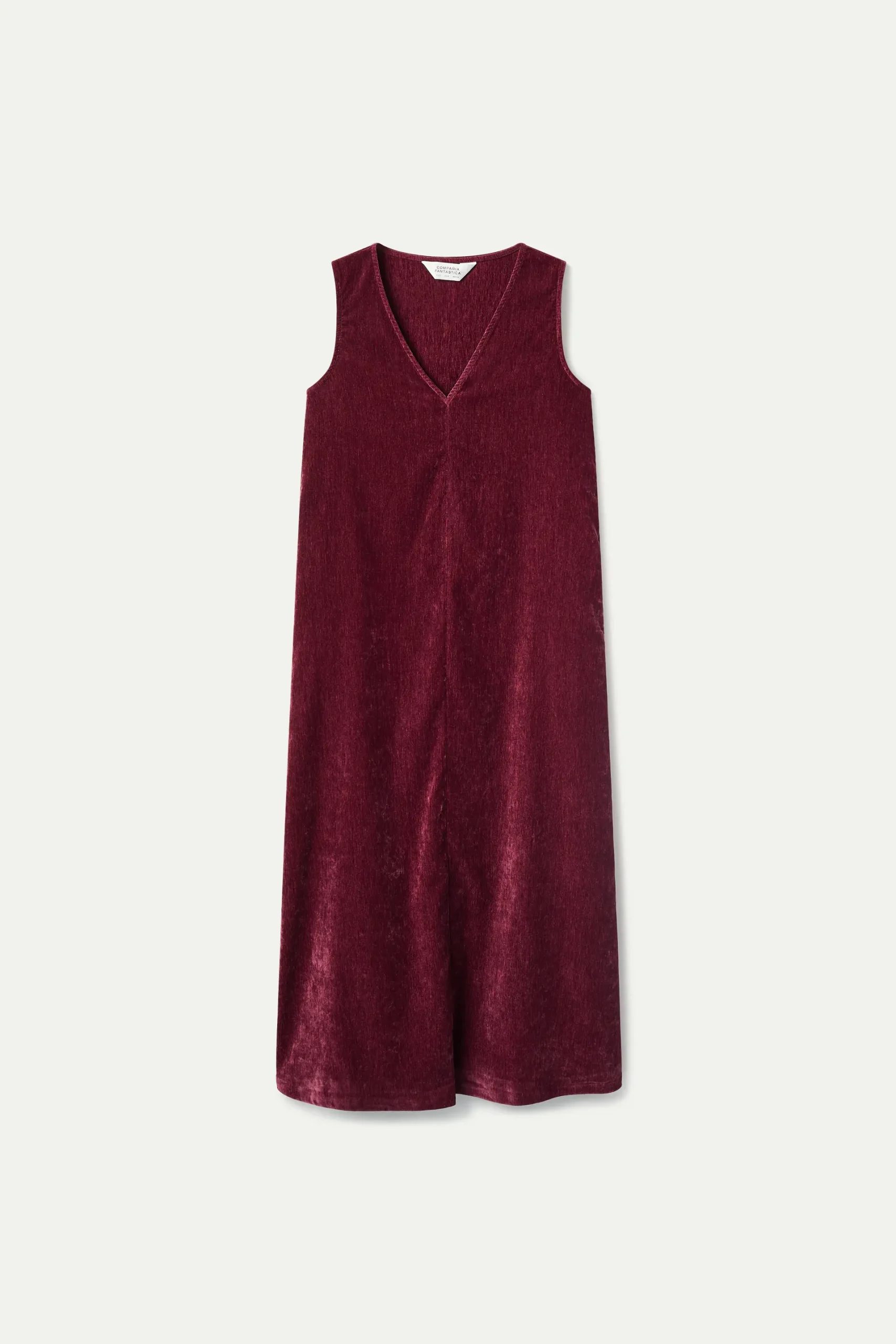 Μακρύ μπορντό φόρεμα σενίλ. V λαιμόκοψη και αμάνικο. Ζώνη στο ίδιο ύφασμα. Το μοντέλο έχει ύψος 174 cm και φοράει νούμερο S.