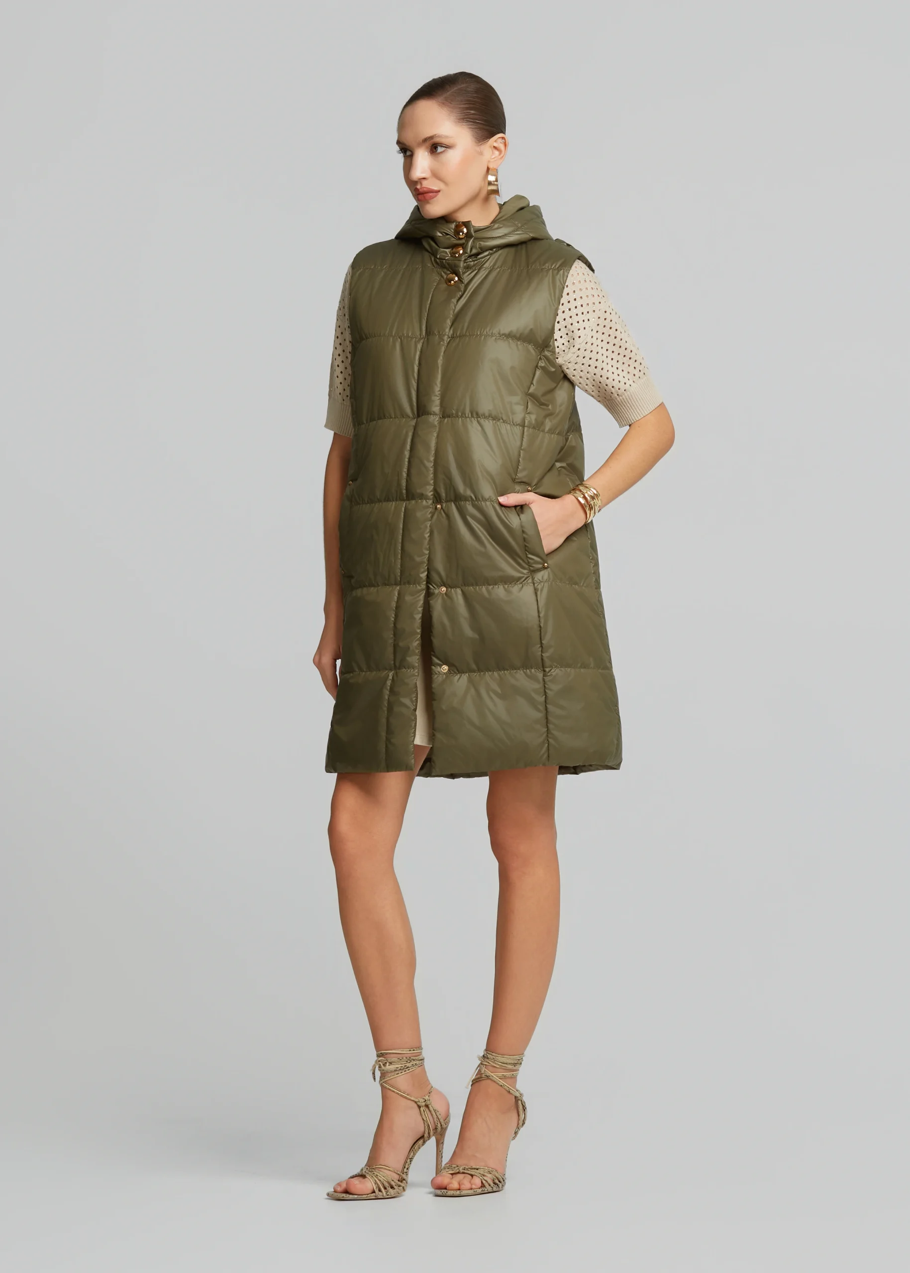 • Αμάνικο μακρύ μπουφάν με κουκούλα και απλικέ λουλούδια