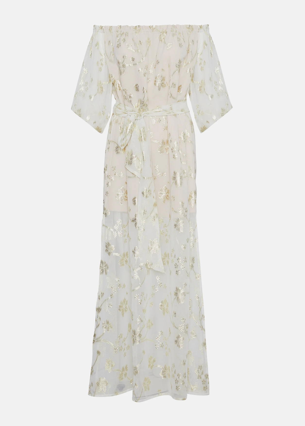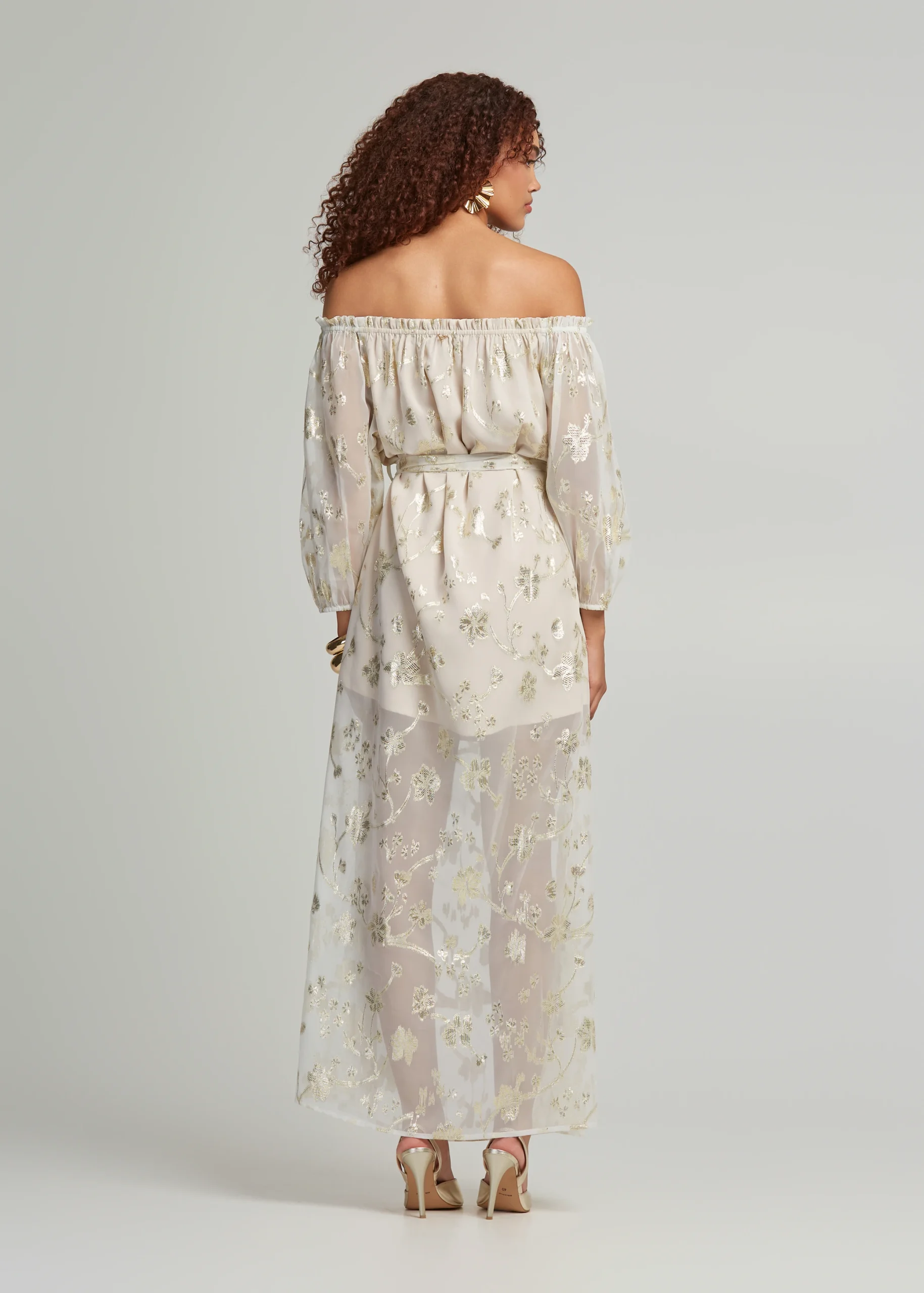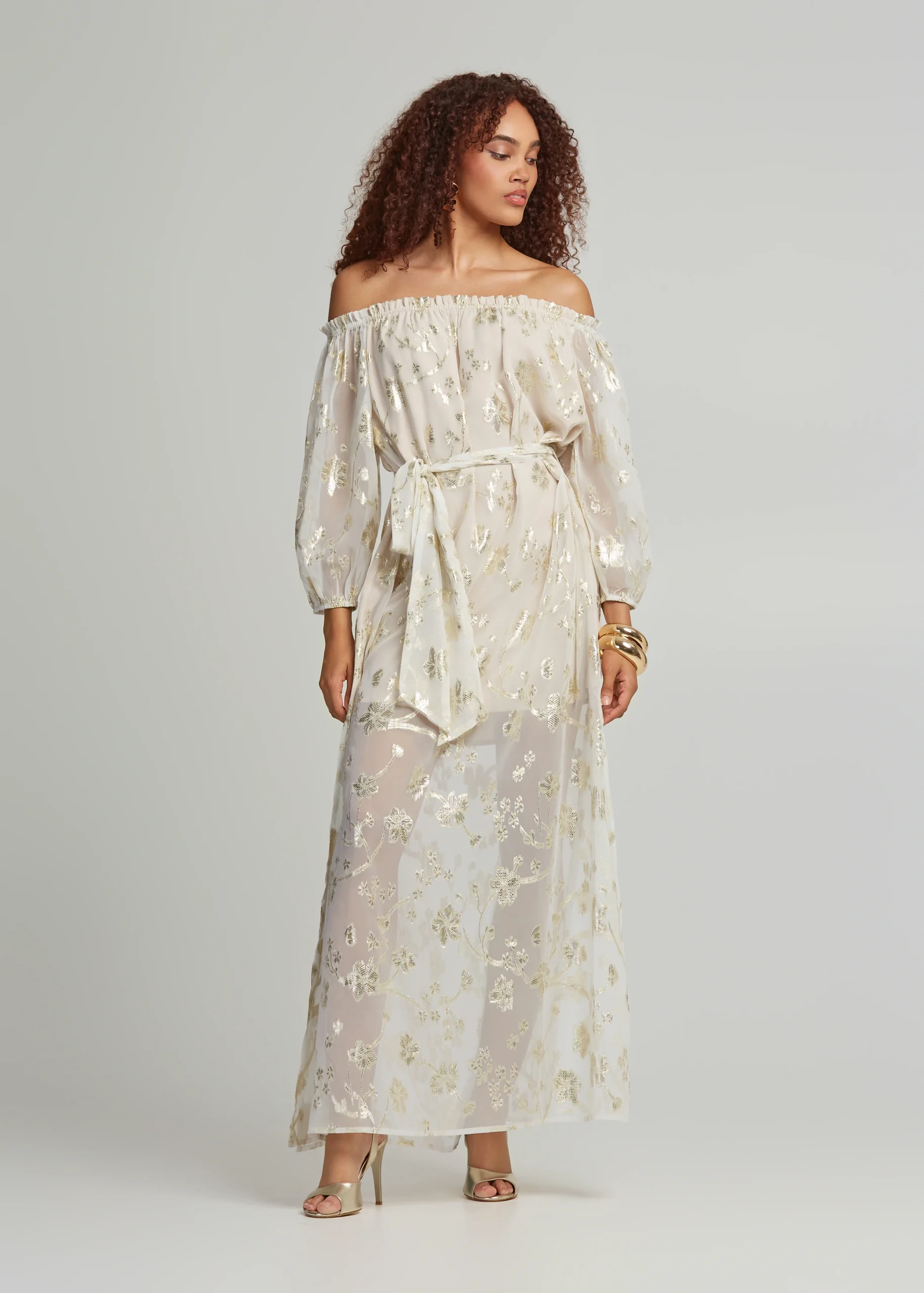 - Μάξι, έξωμο lurex φόρεμα με αποσπώμενη ζώνη