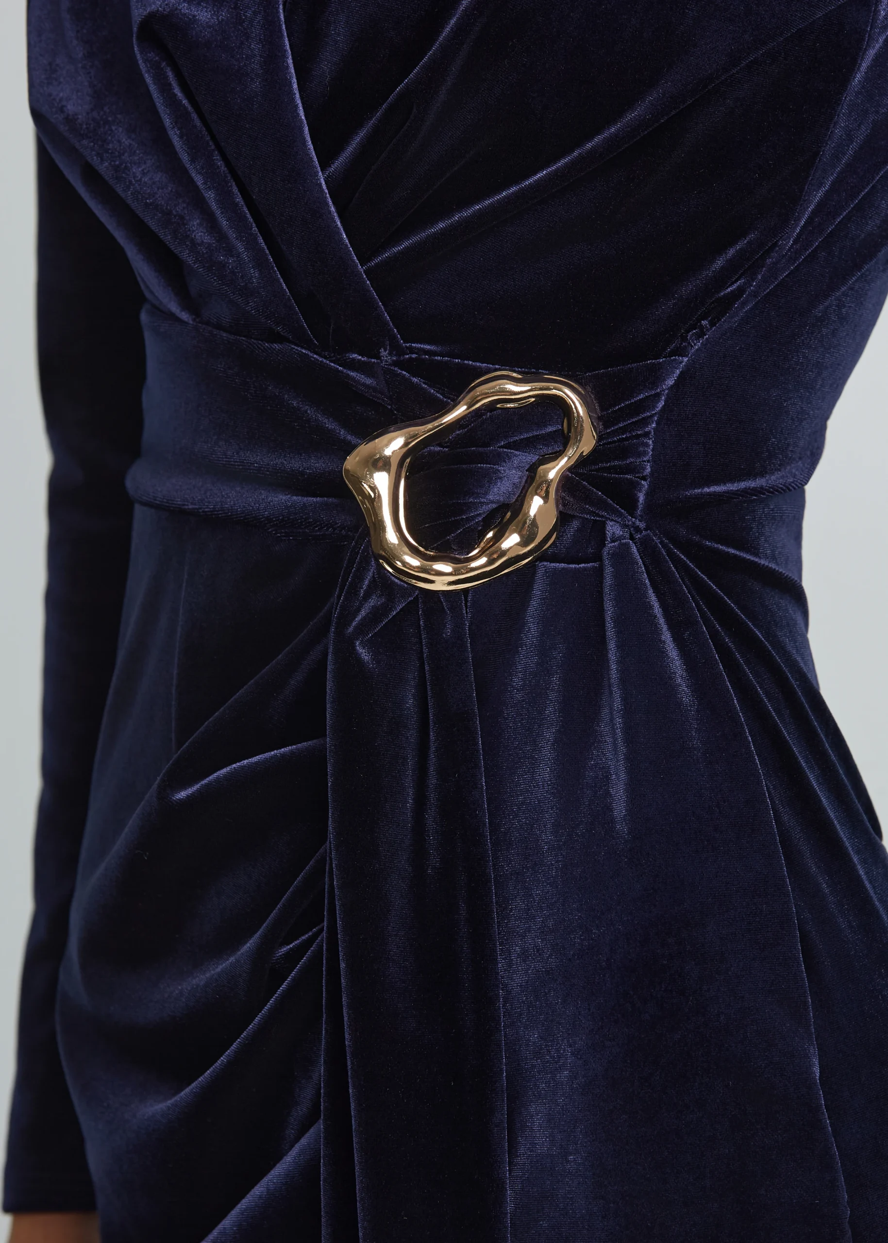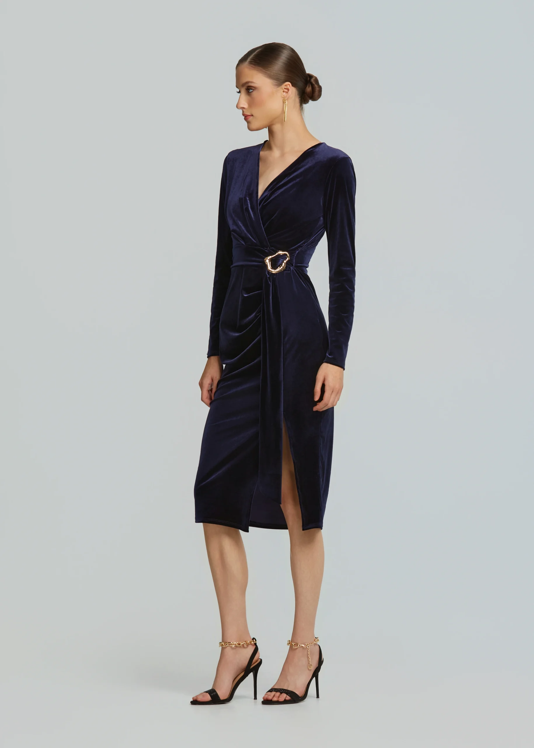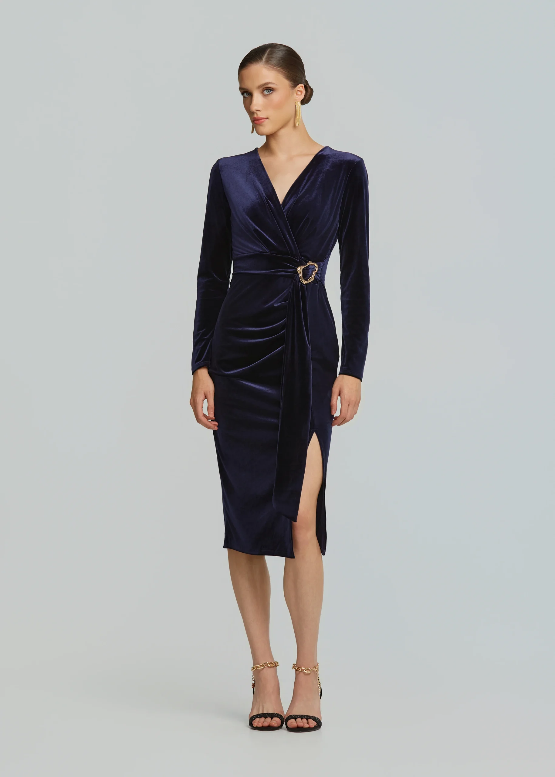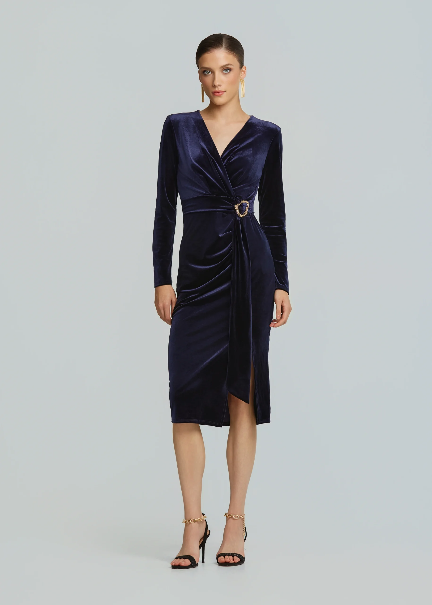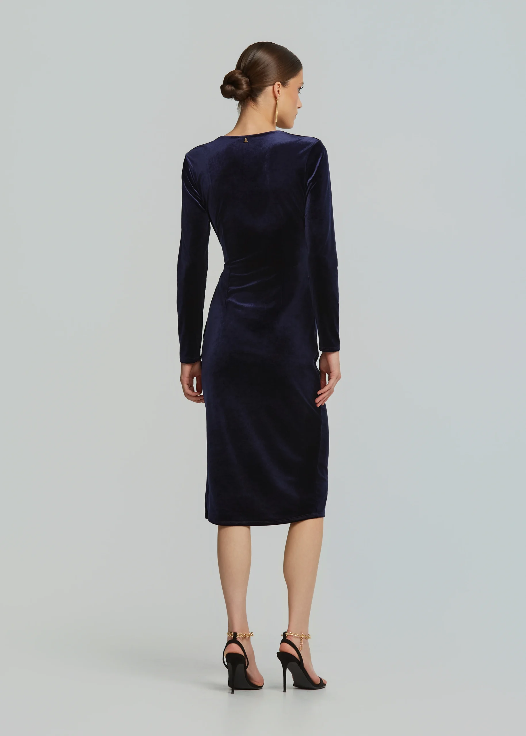 - Μίντι εφαρμοστό φόρεμα με όψη βελούδου και χρυσή μεταλλική λεπτομέρεια
