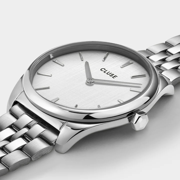 Eίναι ένας κομψός σύντροφος στυλ στην καθημερινή ζωή και σε ειδικές περιστάσεις. Το Féroce Petite για γυναίκες έχει μειωθεί σε μέγεθος, αλλά όχι σε λεπτομέρεια. Διαθέτει ασημένια στρογγυλή θήκη 31,5 mm, λουράκι 5 συνδέσμων από ασημί ανοξείδωτο ατσάλι και καντράν με ασημί λινό υφή. Προσαρμόστε εύκολα την εμφάνιση του ρολογιού σας με οποιοδήποτε λουρί 16 mm. Μπορείτε να προσαρμόσετε το μέγεθος του ιμάντα μόνοι σας.